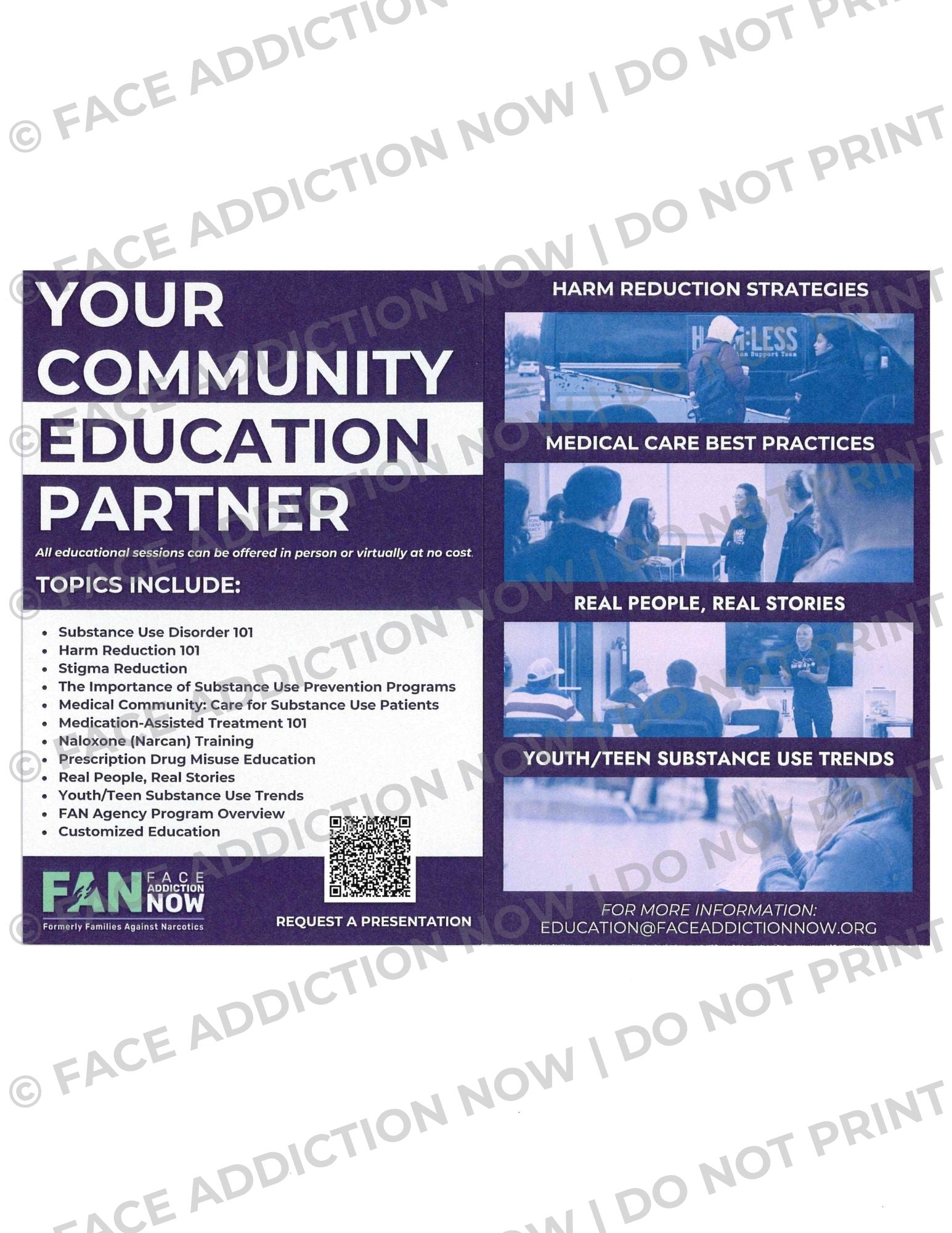 Face Addiction Now’s community education program is free and available virtually or in person—making it easy for your chapter to bring important conversations to your community. Use this rack card to connect with schools, police departments, and other local organizations to raise awareness, address stigma, and provide education on topics like substance use disorder 101, naloxone, and recovery resources.